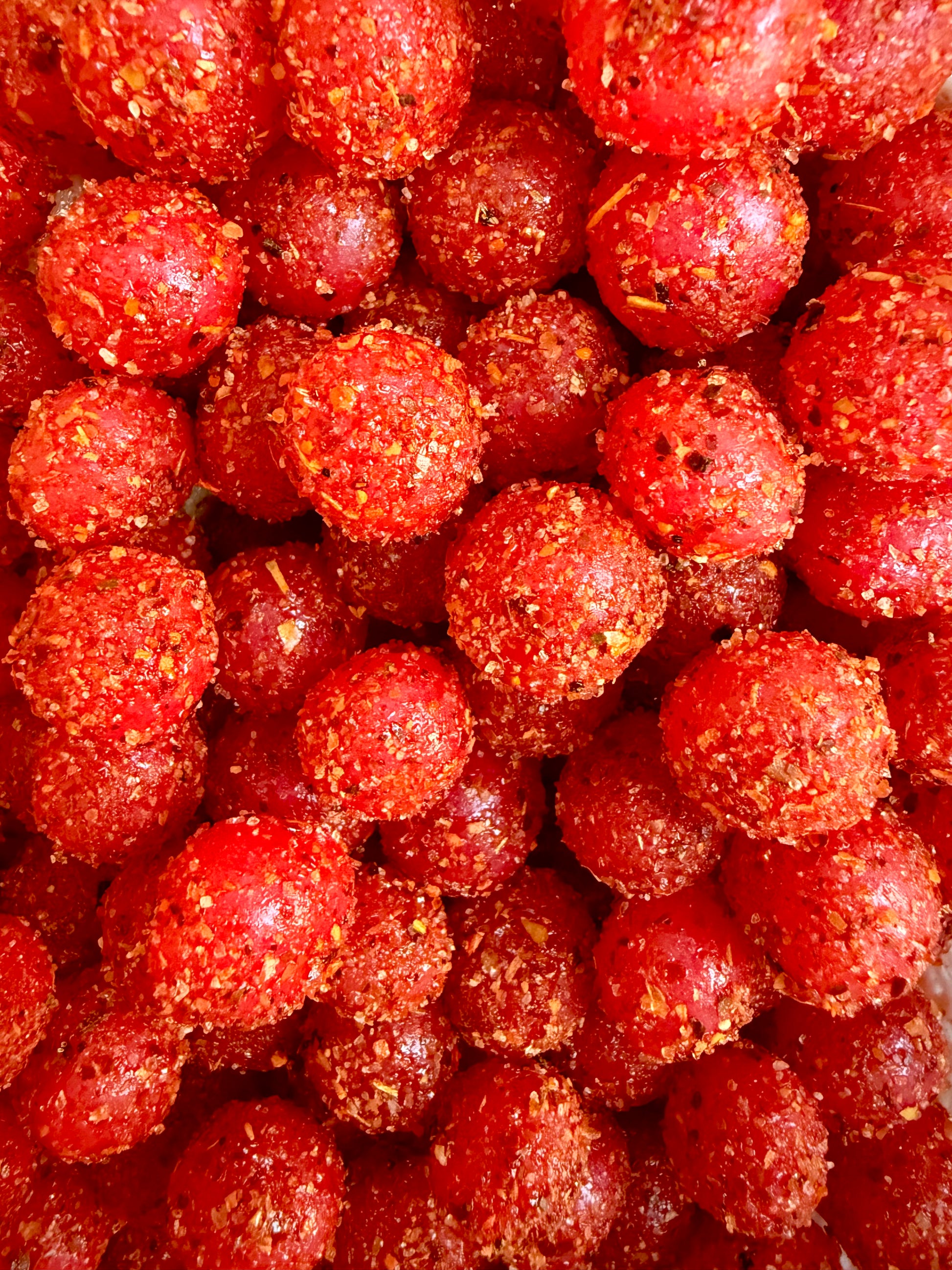 chewy flavored watermelon candies covered in Gordos Snacks chamoy and tajin